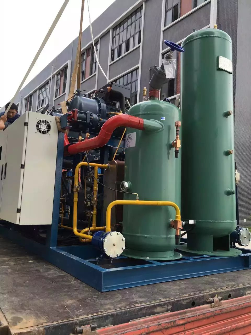● 壓縮機、儲液器、氣液分離器、油分離器、經濟器、回氣集管、供液總管、電控設備全部集中在一起,充分節約機房麵積.