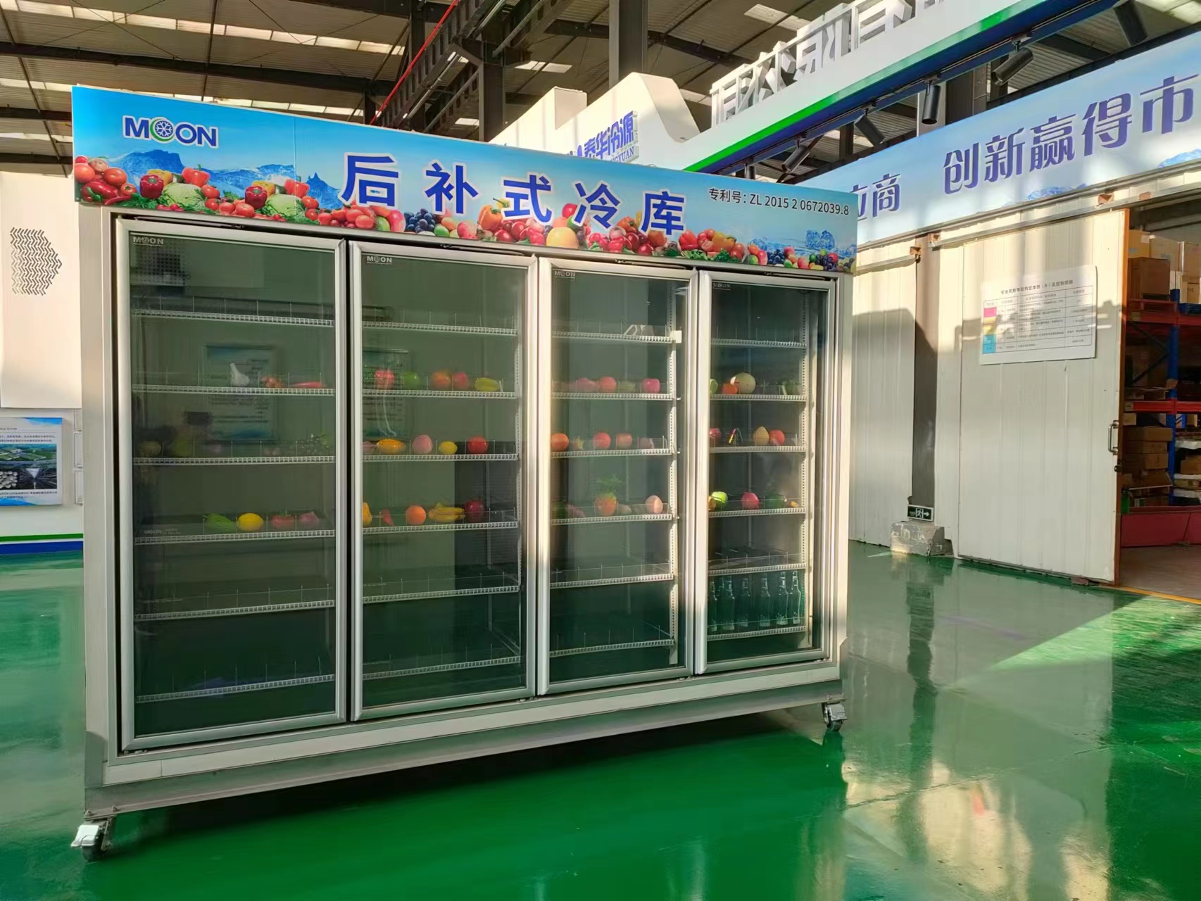 後補式冷庫具備展示及儲存功能,是占地麵積小的多用途冷庫。傳統的冷庫隻有銷售貨架和庫門,顧客取貨和理貨員補貨共用一扇庫門,後補式冷庫具有一個冷藏室,冷藏室的前部設置有銷售貨架,在冷藏室的後部設置有補貨貨架,在銷售貨架和補貨貨架之間設置理貨通道,冷藏室側麵開設補貨門,補貨門與理貨通道相通,理貨員在理貨時可以不影響和幹擾顧客的選購,同時,補充的貨物由於事先是放置於處於同一溫度下的補貨貨架上,因此,可以保證商品溫度的一致性。冷藏室前端設有玻璃門,方便顧客選購商品的同時,而且不受店內空調及其他設備影響,冷卻性能穩定,更節能。